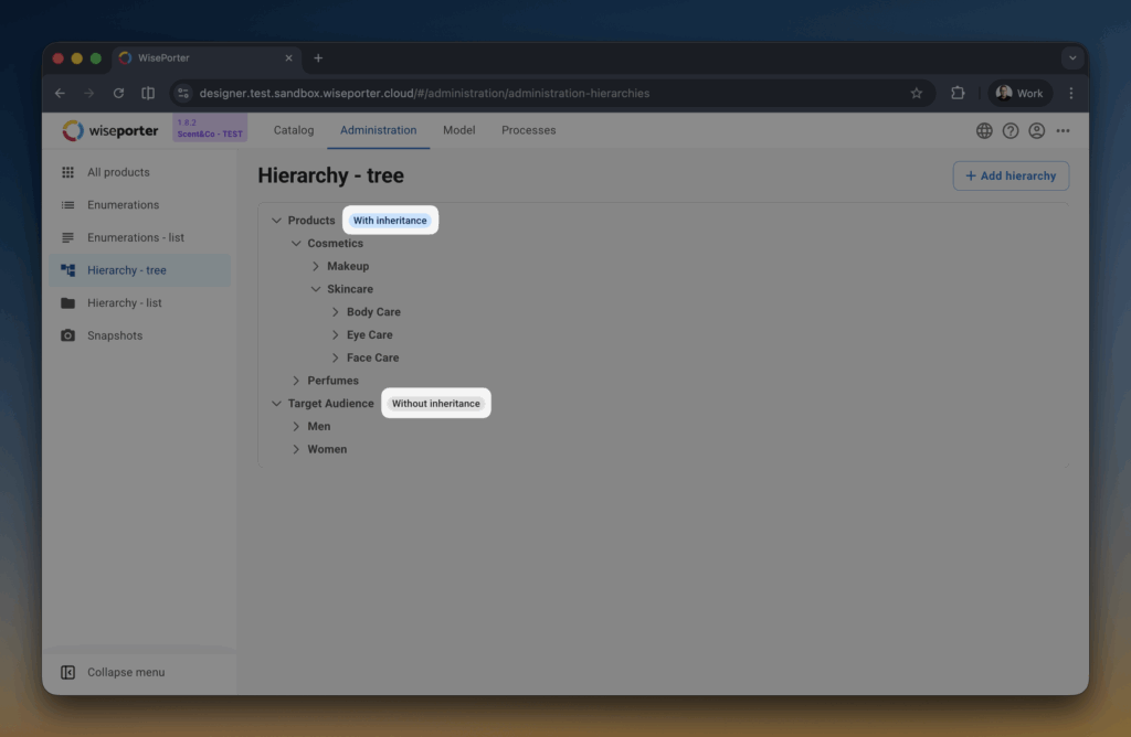 Hierarchies in WisePorter are tree-based category structures. They are used not only for product organization, but also for parameter inheritance.